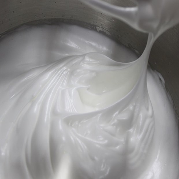 Cho đường vào từ từ (chia 3 lần), tiếp tục đánh đến khi bông mềm, tạo chóp cong nhẹ.
